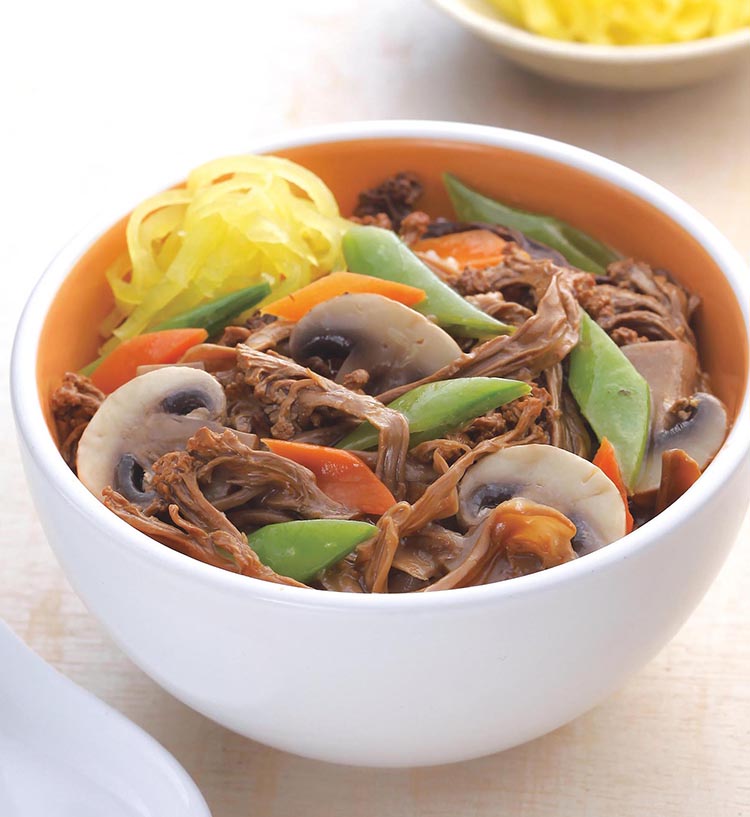 5.白饭盛碗,淋上作法4的烩料,放上醃渍黄萝卜即可。