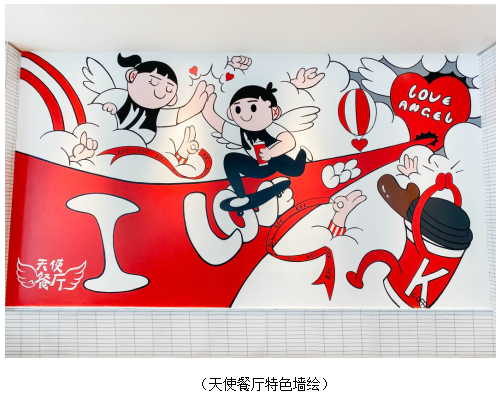 2021年,肯德基天使餐厅迎来了重装启航,与一年前相比,这家餐厅变得更加励志和温暖:外围卡通趣味的窗贴展示着各色各样的天使形象,主题墙绘上天使正在赛道上尽情奔跑,此外,餐厅内的每张桌上还贴着 “辛苦了”、“爱”、“谢谢”、“朋友”等一些表达着日常生活中象征积极和美好的词语的漫画桌贴,“店内顾客可以通过桌贴学习一些简单的手语,以天使们熟悉的方式现场给予他们鼓励。”黄斌说,餐厅里这些细微而有爱的布置拉近了顾客与“天使”的距离,让“天使”们变得更加自信。