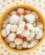 天山雪莲子,莲子百合甜汤 【材料】 莲子100公克 百合50公克 枸杞10公克 水1200cc 【调 味 料】 冰糖50公克 【做法】 1.莲子、百合分别洗净,泡水备用;枸杞洗净备用。 2.将作法1的莲子、百合放入电锅内锅中并加入水,外锅加2杯水煮
